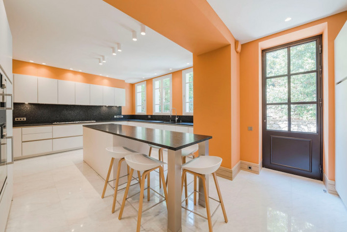 Toilettes invités avec vestiaireBureau / bibliothèque avec vue sur la merSalon avec cheminée et salle à manger donnant sur la terrasse et le jardinCuisine entièrement équipée avec une arrière-cuisine supplémentaire (entrée de service)