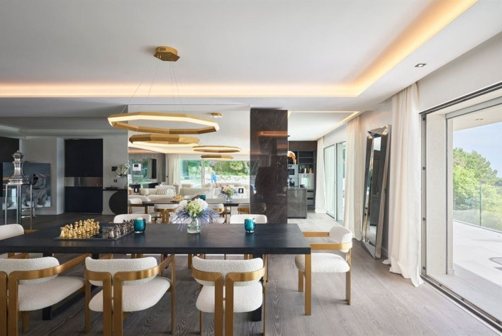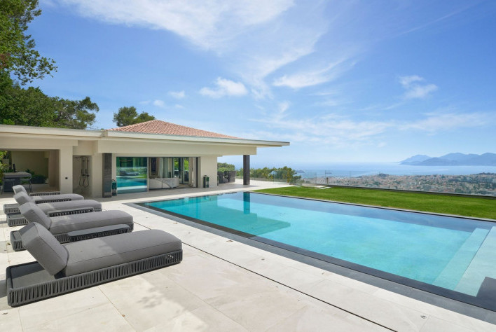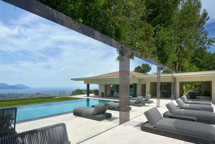 La villa offre une vue mer panoramique sur la baie de Cannes, les Iles de Lerins et le massif de l'Esterel. Son exposition Sud / Ouest lui assure le meilleur ensoleillement. Elle propose une superficie totale de 875 m² et environ 700 m² habitabel sur 3200 m² de jardin.