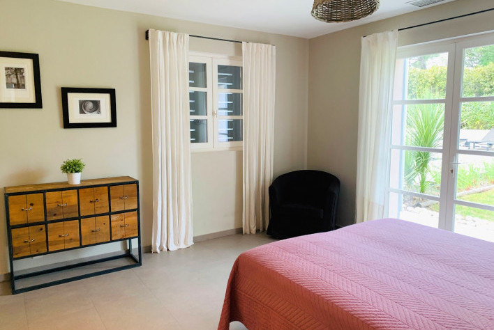 Hall d’entrée avec toilet invitées, grand cuisine Américaine avec accès directe à la terrasse couverte, salle à manger, séjour et buanderie. Au rez de chaussée il y a 4 chambres doubles avec 4 salles de bains et 2 chambres ont accès direct au jardin.