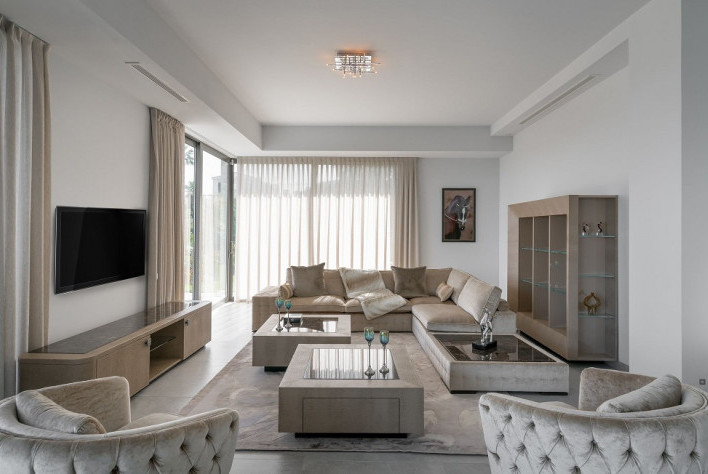 Au niveau inférieur, buanderie, chaufferie, cave à vin, salle de fitness, sauna, hammam, salle de relaxation et de massage, salle de cinema.